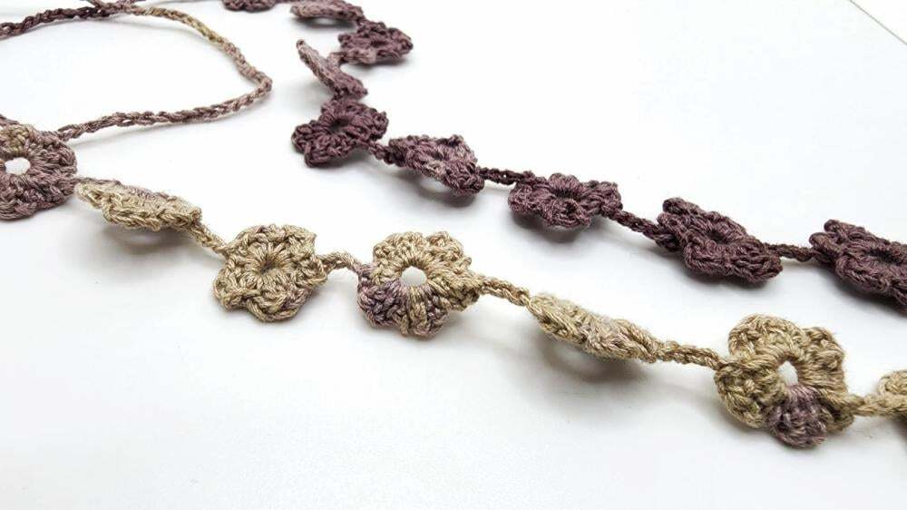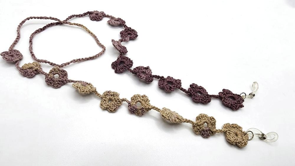 Inspired by the cozy calm of autumn, this handmade eyeglass chain features soft crochet florals in earthy hues. It adds a seasonal elegance to your look, echoing nature’s quiet beauty and charm.