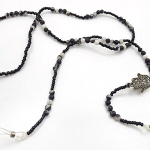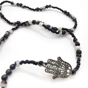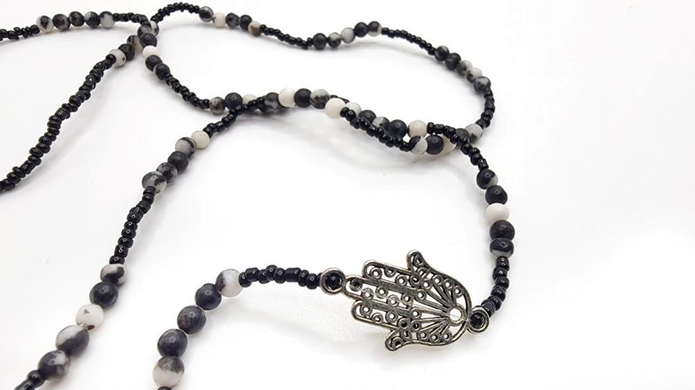 A minimalist yet meaningful accessory, this handmade chain features alternating black and white beads with a silver Hamsa charm—a timeless symbol of protection and balance. It brings a serene, grounding touch to your everyday look.