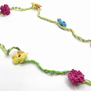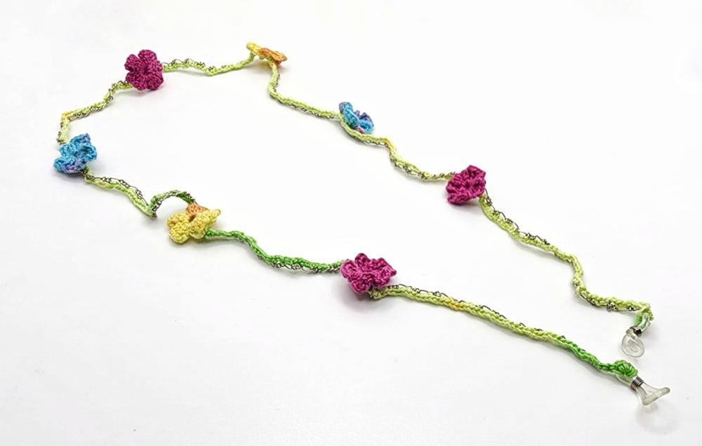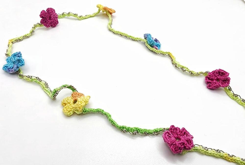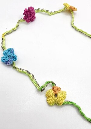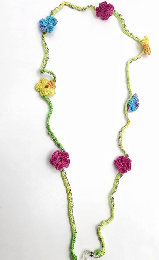 A handmade bloom of joy, this colorful crochet chain is adorned with tiny yarn flowers and bursting with spring hues. Its multicolored threads and delicate floral touches weave a spectrum of vibrance and softness, like a miniature garden spun from thread.