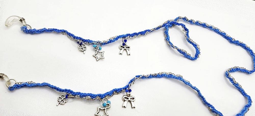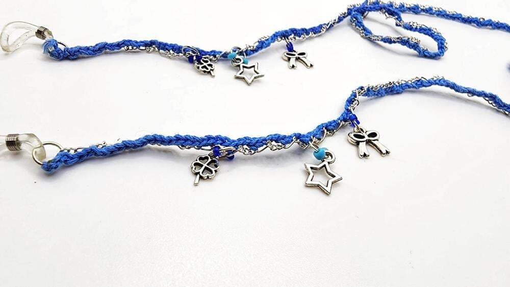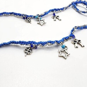 سلسلة مبهجة تضيف لمسة من الحيوية إلى يومك. مصنوعة يدوياً من خيوط زرقاء مضفرة ومزيّنة بقطع فضية لامعة تشمل نجوم وأزهار وأشكال مرحة، تمنحك إطلالة مرحة ومفعمة بالحيوية.